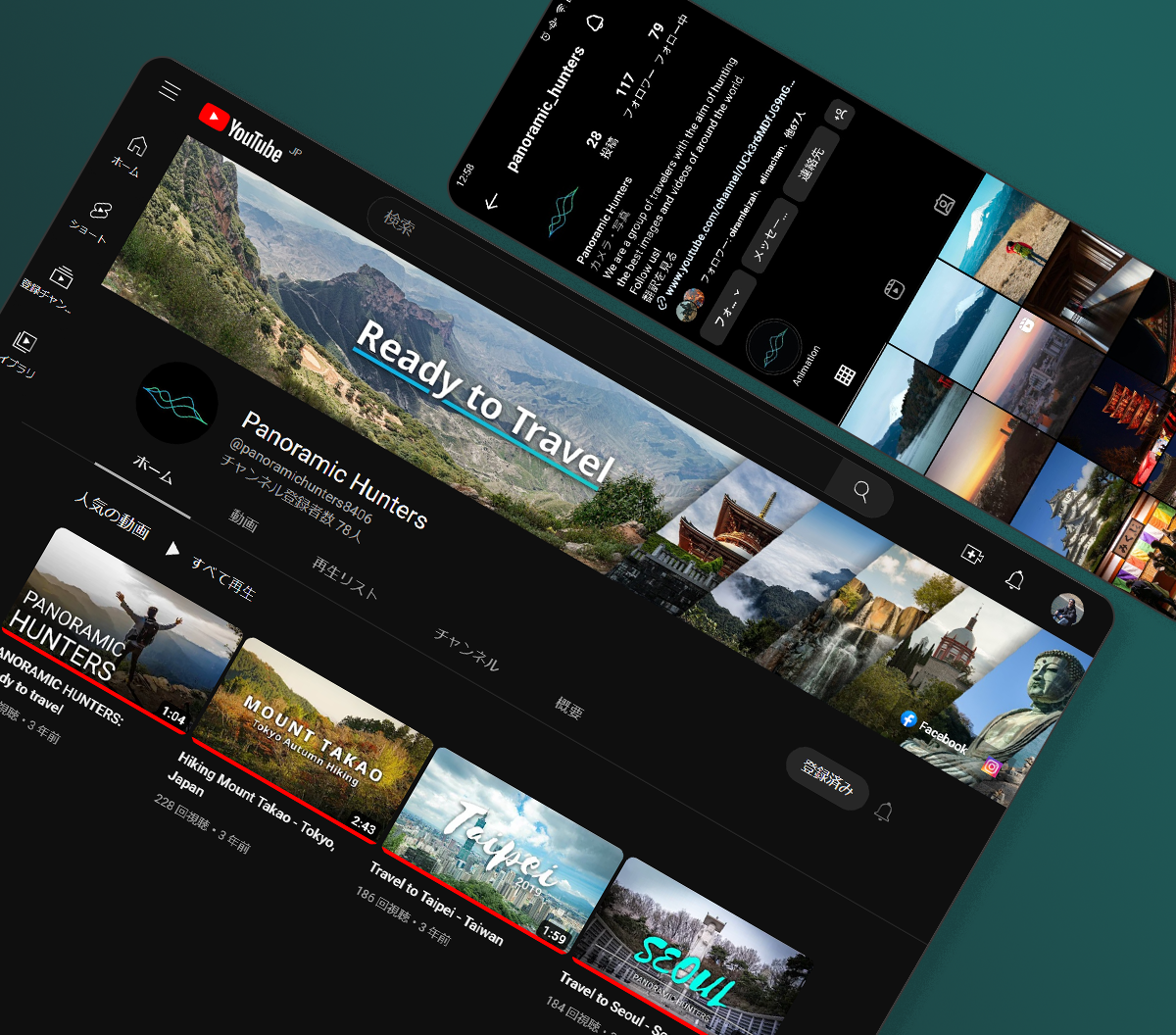 旅系YouTubeチャンネル用に作成したロゴデザイン。アジアとメキシコの両方からコンテンツを投稿するチャンネルというコンセプトから作成を行いました。ロゴだけではなく、YouTubeページ用のバナーデザインやFacebookページのグラフィックも担当しました。