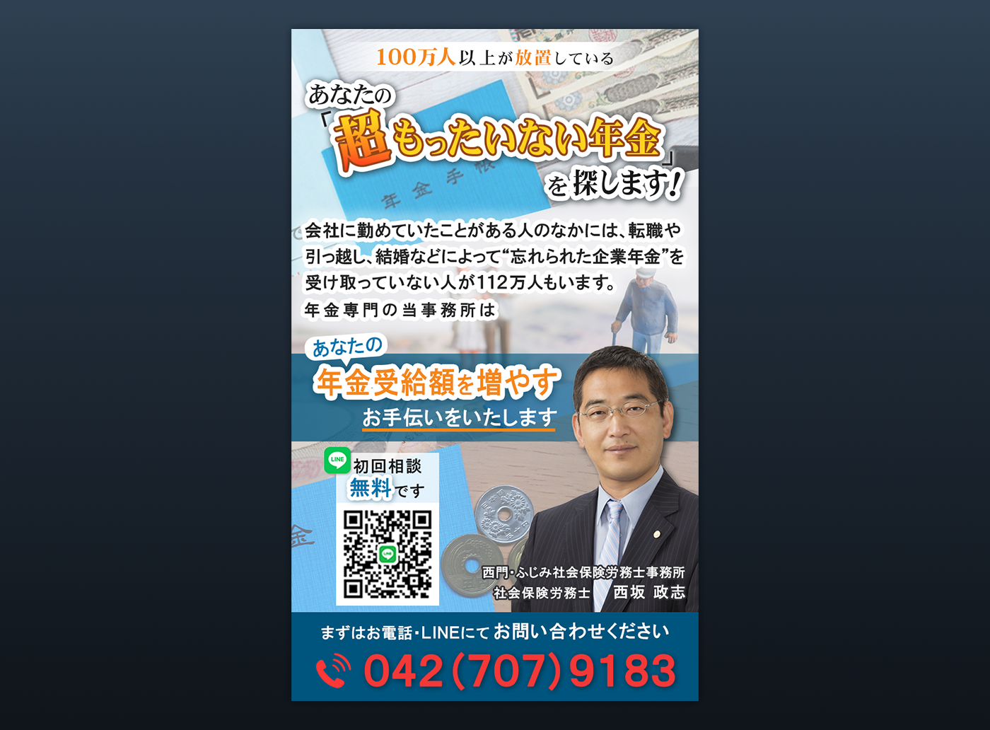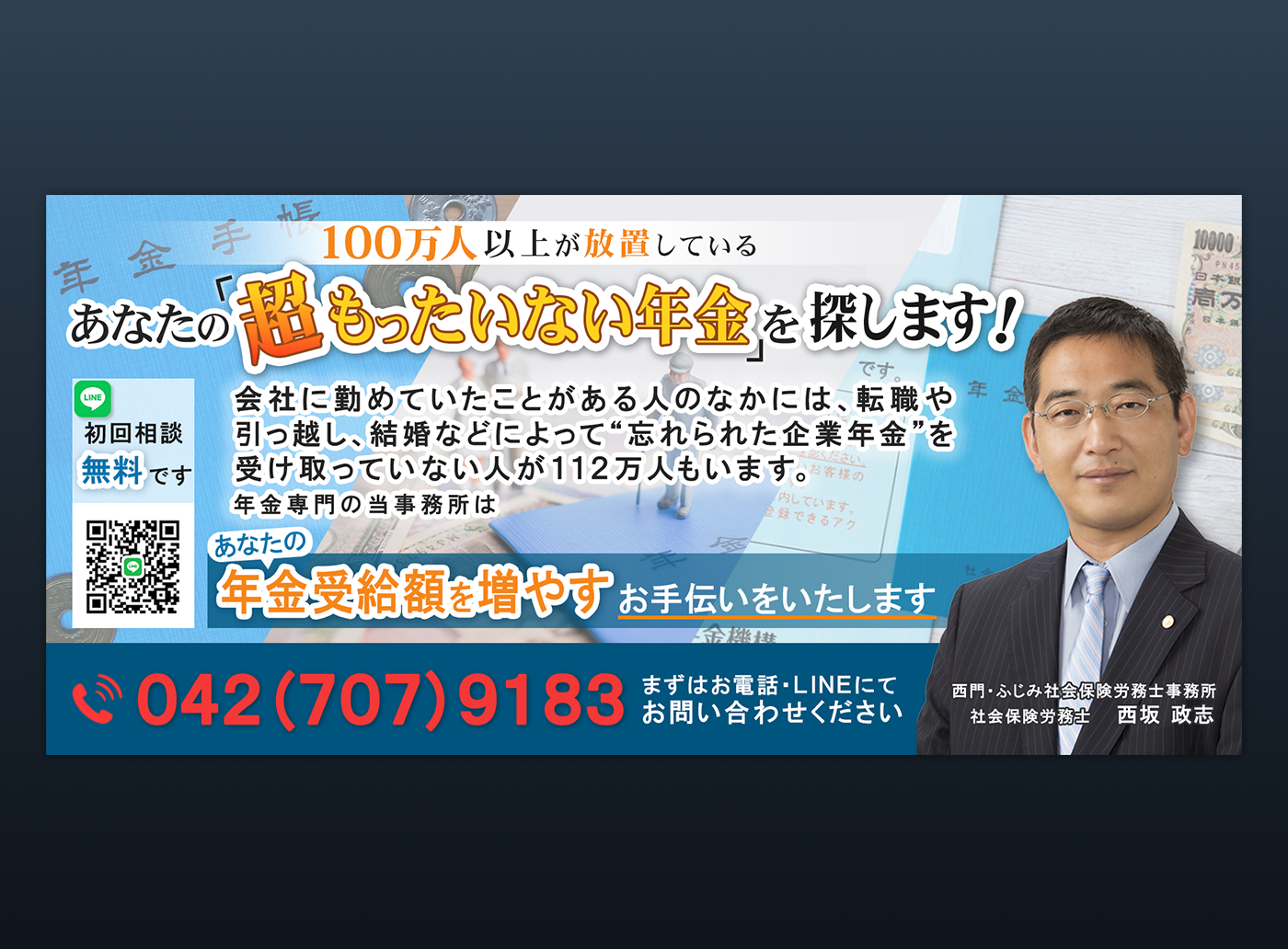 2025.12.05 Graphic Design Pension website’s banner sasaguri-hiroshi Banner Design 年金相談に関する日本のウェブサイトのバナー制作を担当。ウェブサイトとスマホ画面用のトップ画像を制作。 使用ソフトUsed Software Adobe Illustrator Abode Photoshop https://www.instagram.com/hiroshi.sasaguri/ LinkedIn メール